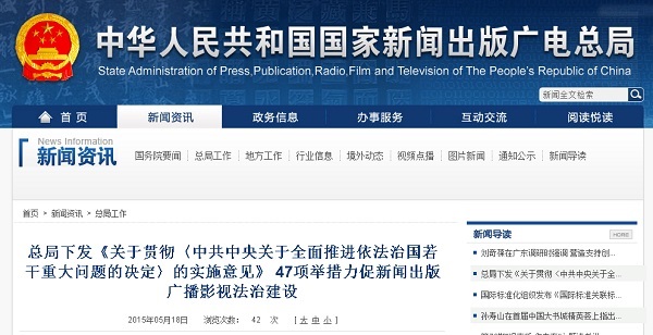日前,国家新闻出版广电总局下发《关于贯彻〈中共中央关于全面推进依法治国若干重大问题的决定〉的实施意见》,对新闻出版广播影视(版权)系统全面推进法治建设,强化科学立法、严格执法、全民守法,加强法治队伍建设,促进新闻出版广播影视(版权)治理体系和治理能力现代化,依法推动新闻出版广播影视(版权)实现全面、协调、可持续发展作出具体部署。